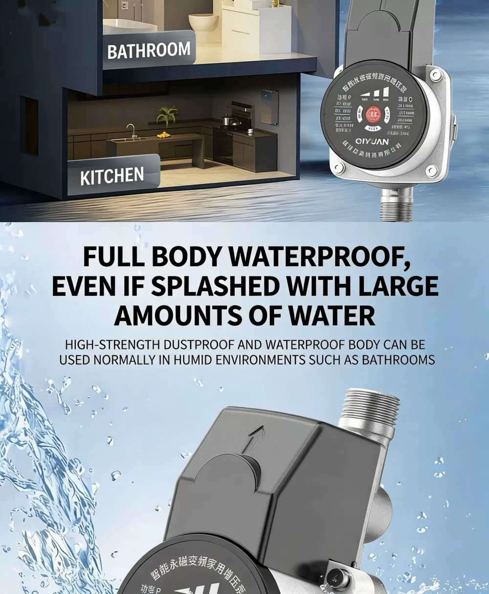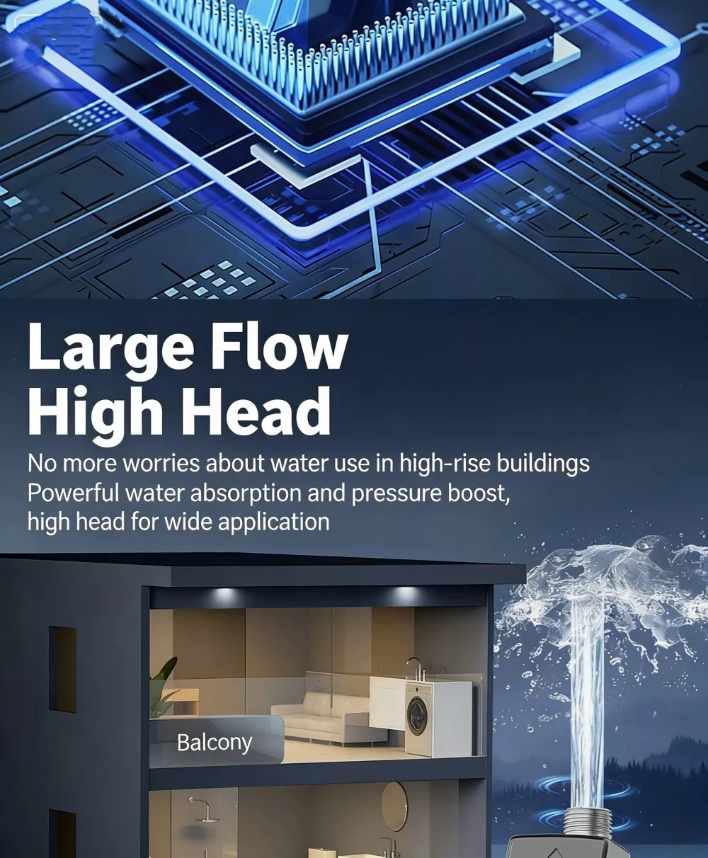 Kawalan Mula-Henti Pintar: Peranti pengesan aliran air sensitiviti tinggi terbina dalam mengesan permintaan air secara automatik, memulakan pam apabila air digunakan dan menutupnya apabila aliran air berhenti. Ia menghalang badan pam kering, mengurangkan haus mekanikal, dan memanjangkan hayat perkhidmatan keseluruhan unit dengan berkesan.