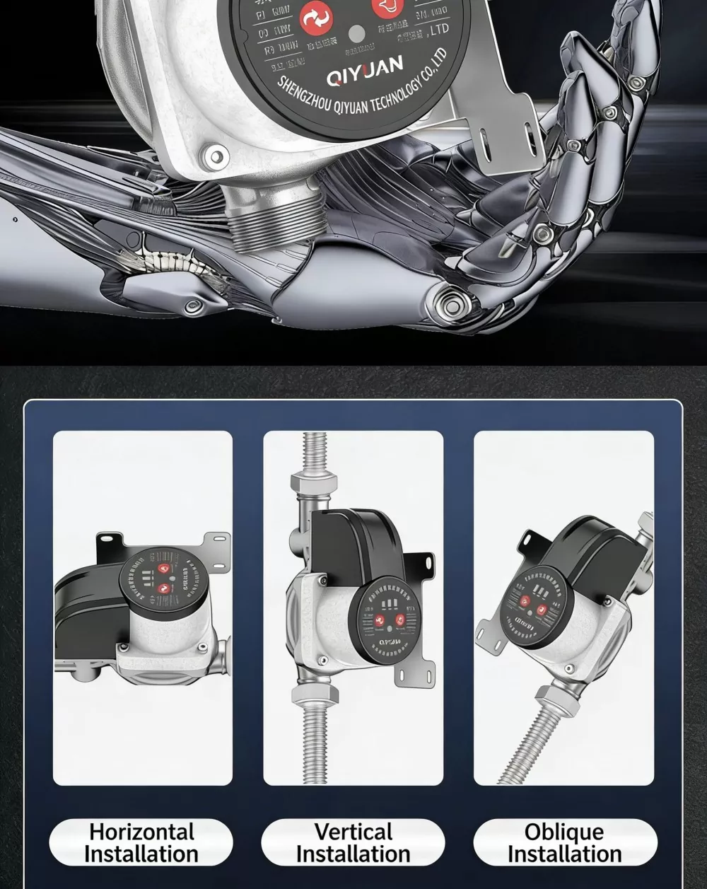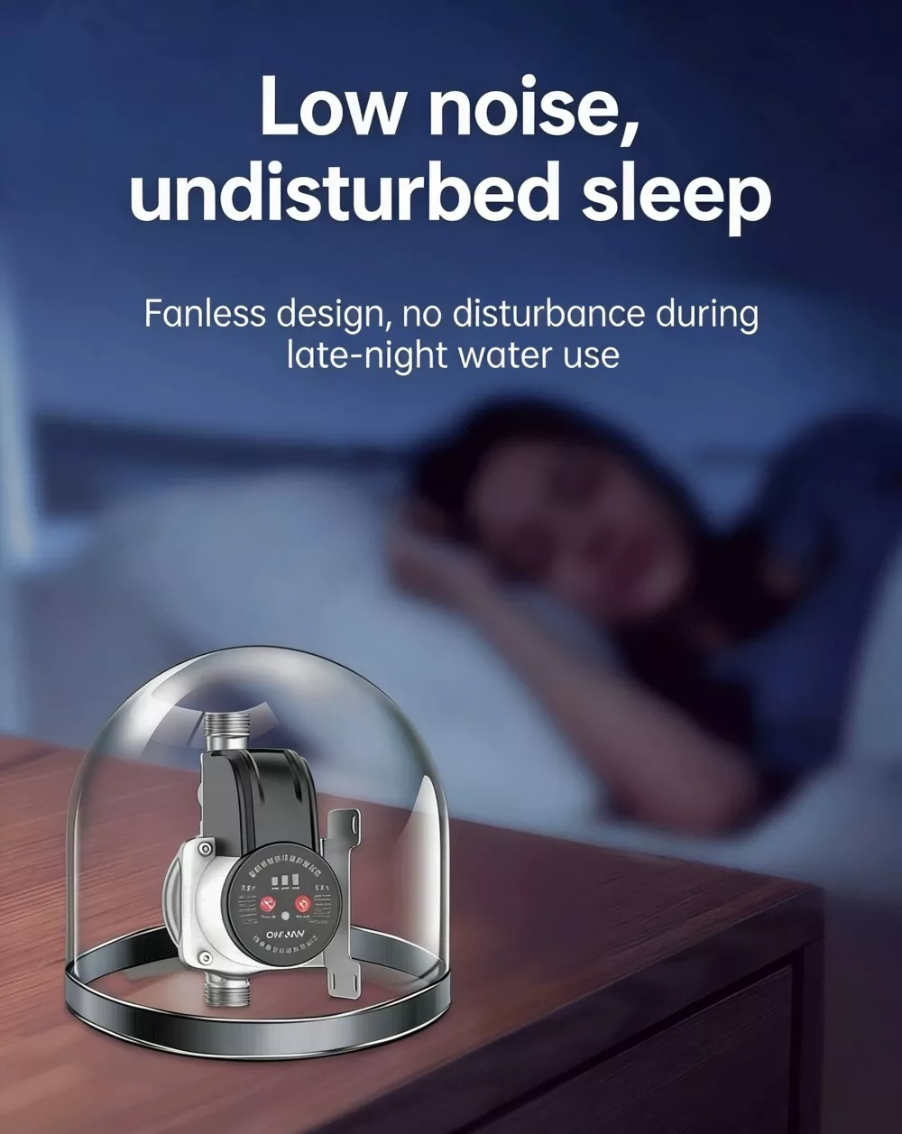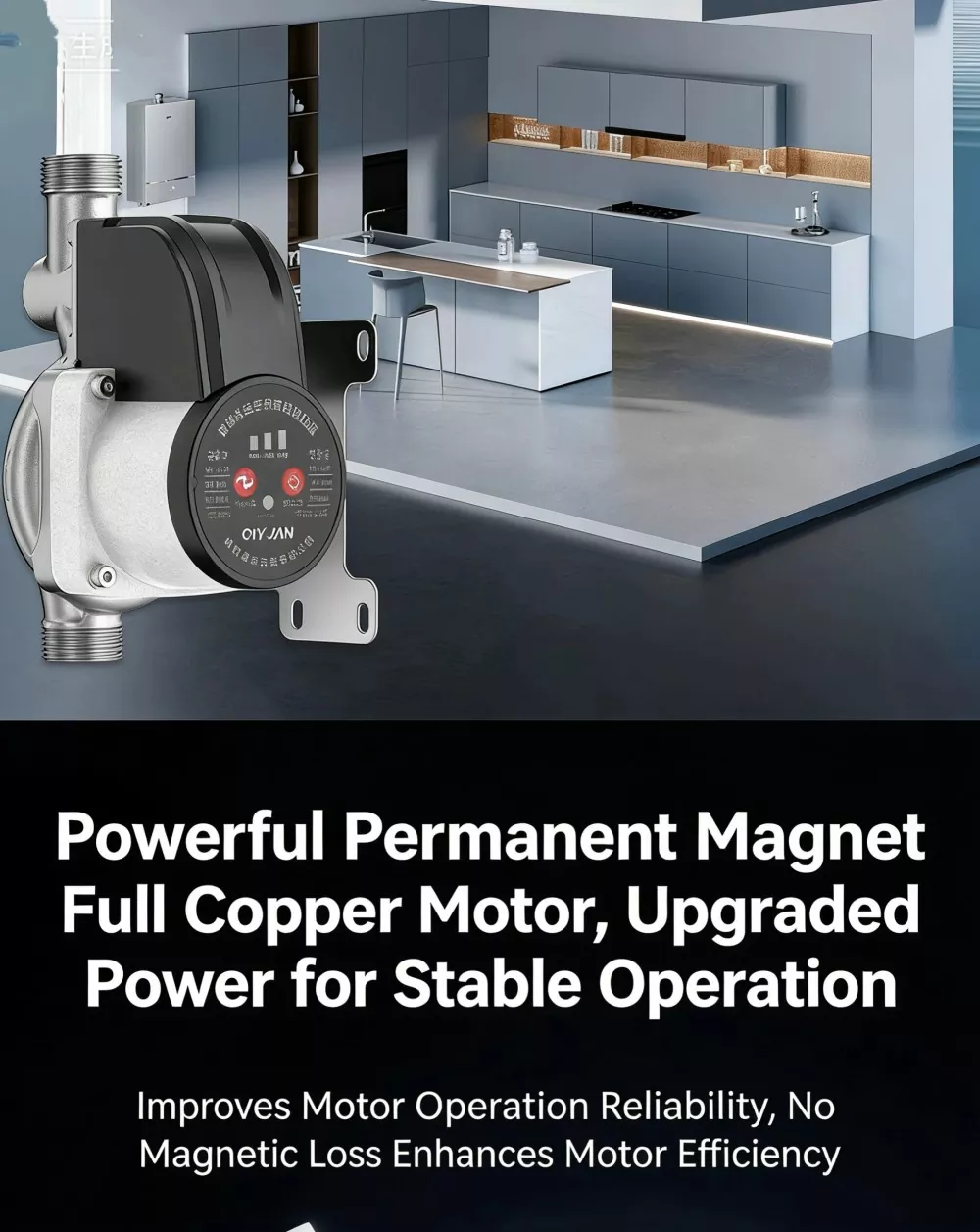 Dilengkapi dengan motor magnet kekal tanpa berus dan galas ketepatan, pam berjalan dengan bunyi yang sangat rendah, tidak menyebabkan gangguan kepada kehidupan seharian walaupun dipasang di dalam rumah. Motor ini mempunyai belitan tembaga penuh untuk pelesapan haba yang sangat baik dan hayat perkhidmatan yang panjang.