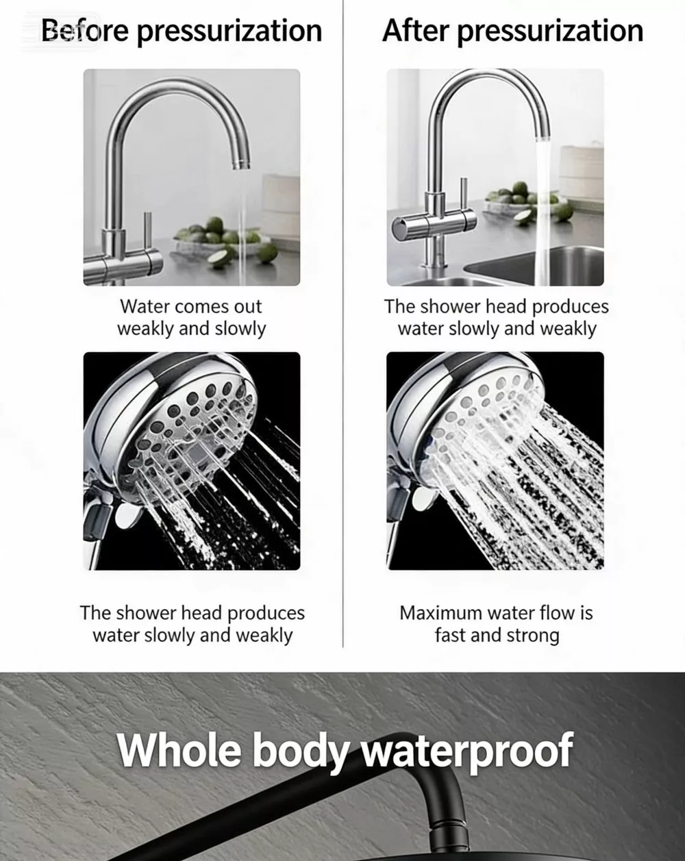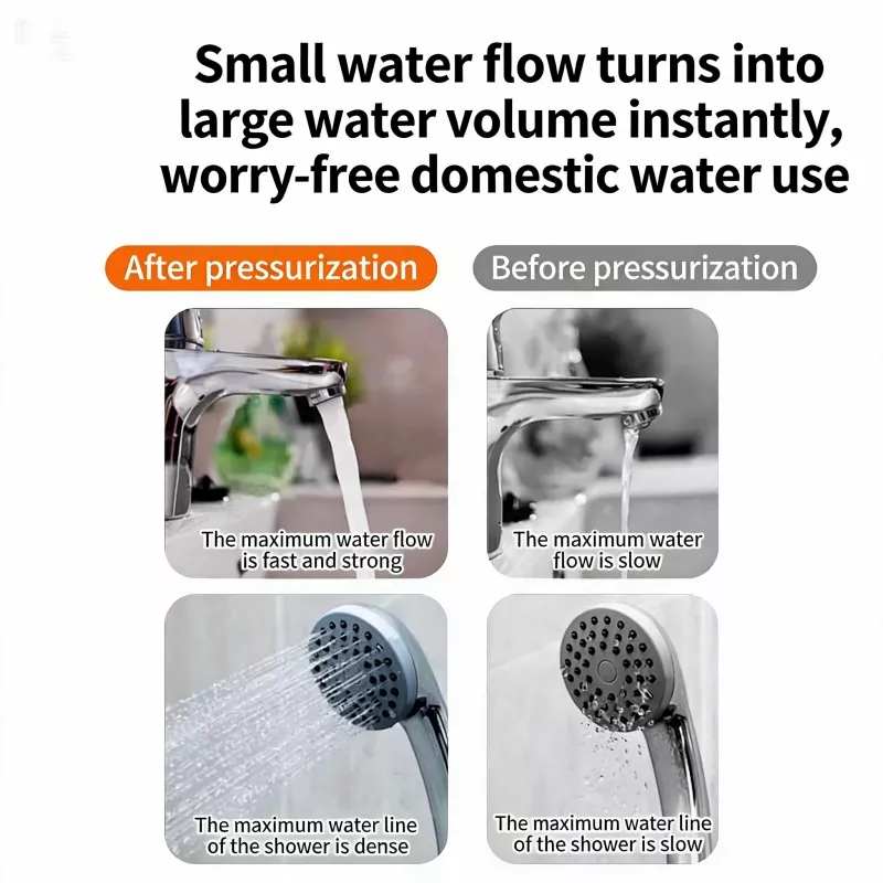 Peningkatan tekanan kepala pancuran: Tingkatkan pengalaman mandi, hentikan aliran air yang lemah dan perubahan suhu air sejuk & panas secara tiba-tiba.